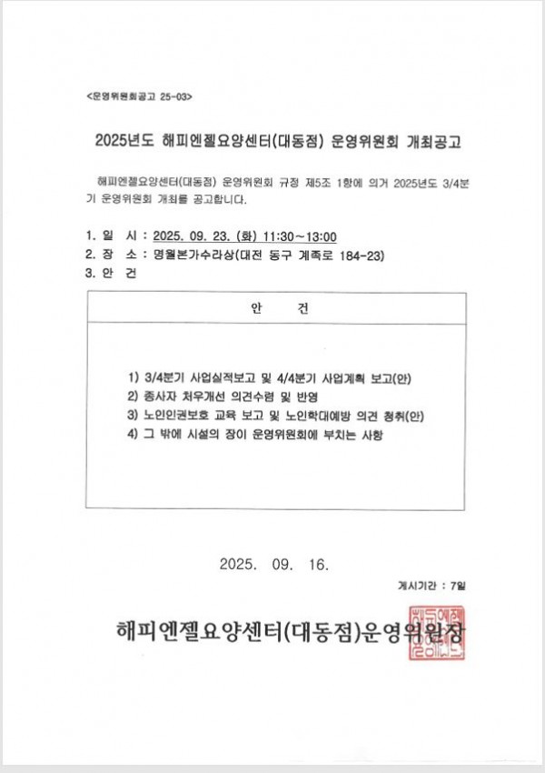 2025년 해피엔젤요양센터(대동점) 3/4분기 운영위원회 개최공고 해피엔젤관리자 0 45 09.17 15:08 2025년 해피엔젤요양센터(대동점) 3/4분기 운영위원회 개최공고 올려 드립니다