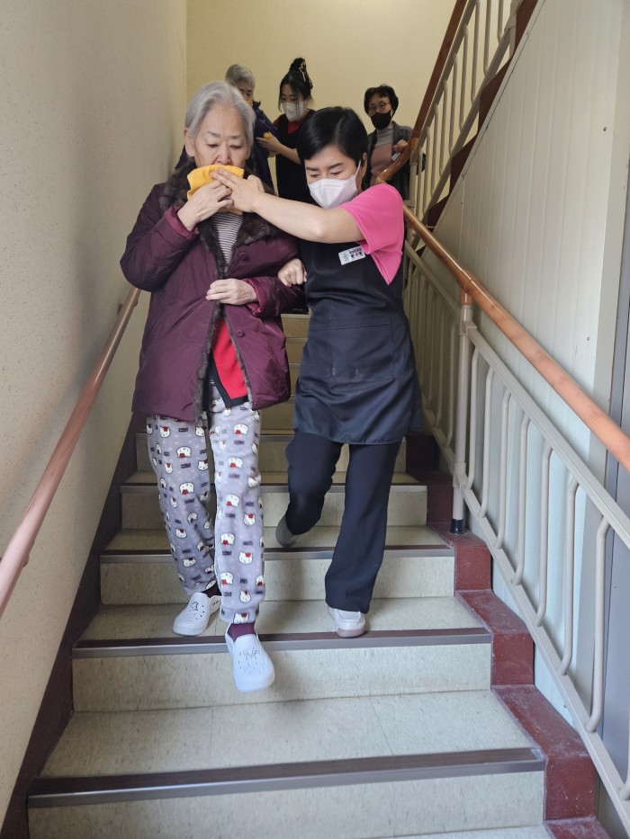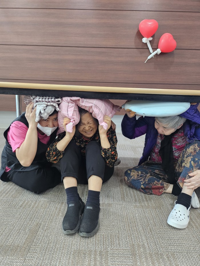 재난이 발생했을 때 어떻게 해야 되는지 다같이 교육을 듣고 훈련을 하였습니다